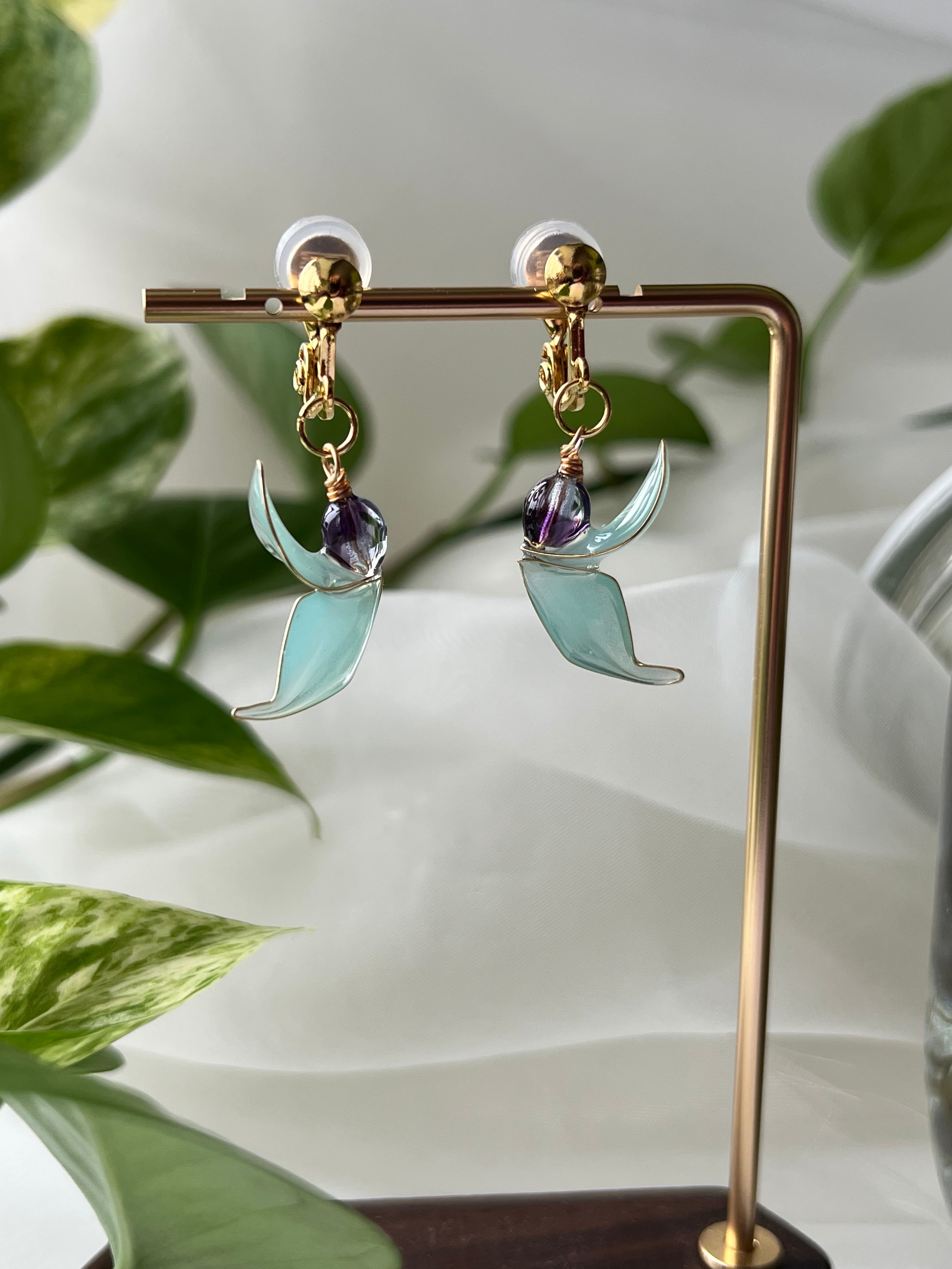 南国の森に咲く幻想的な花「ヒスイカズラ」を、ひとひらだけそっと耳元に添えたような、可憐なサイズの耳飾りです。